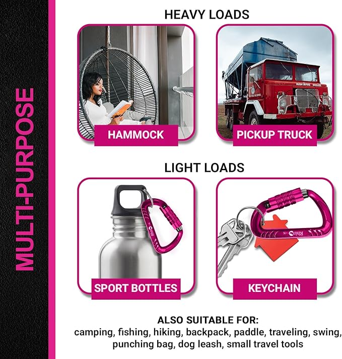 - 【Multi Purpose】 Rhino locking Carabineers are suitable for: hammock, camping, fishing, hiking, backpack, paddle, traveling, swing, punching bag, dog leash, attach sports bottles, yeti sling, keychain, travel tools, fix heavy object on a pickup truck, backpack clips for kids, keychain for women, bag hook, snap hooks, key clip for men, accessory & keychain carabiners, gear ties, toy grappling hook, cable machine accessories, key holder, d ring, boxing bag. Not For Climbing.