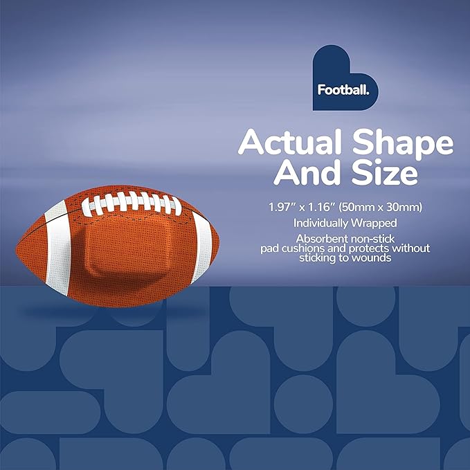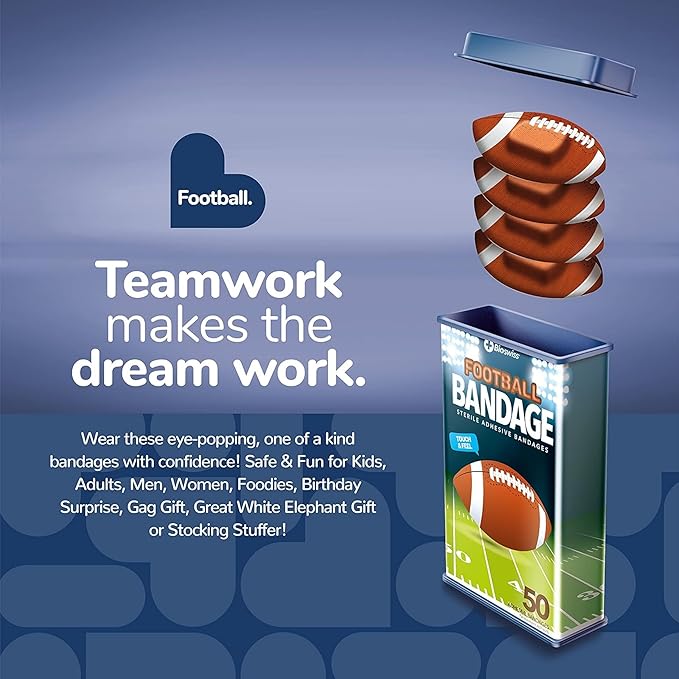 - FOOTBALL BANDAGES: This 50 piece tin of stylish football bandages is great for putting a smile on kids' faces while protecting wounds such as cuts, scrapes, and burns; sticky bandages are perfect for kids and adults alike, and also for school nurses and pediatric doctors
