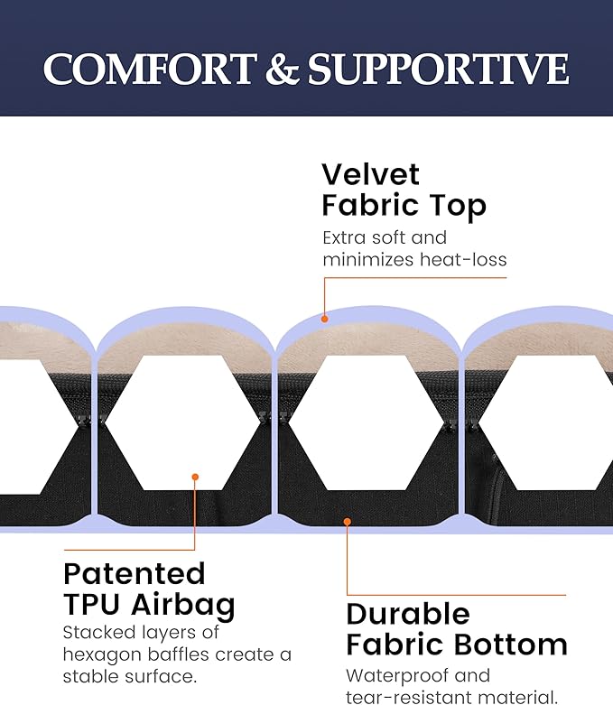 - PATENTED HEXAGONAL SUPPORT: The patented hexagonal airbag design creates a stable surface, offering unmatched comfort whether you sleep on your back, side, or stomach. It allows you to freely adjust your body balance and comfort. With 4.75 inches of extra thickness, it keeps your body elevated from the ground, providing insulation from the cold and ensuring a restful night’s sleep