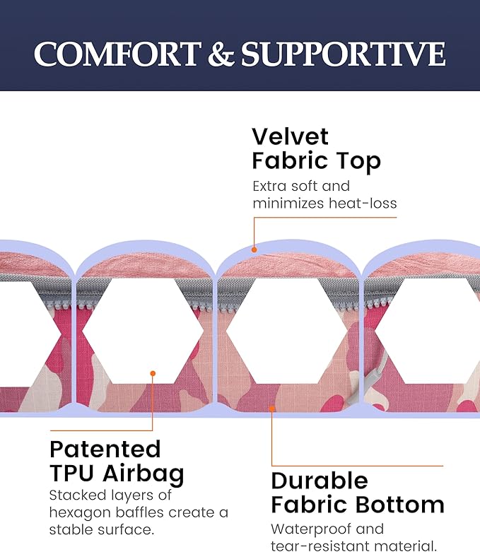- PATENTED HEXAGONAL SUPPORT: The patented hexagonal airbag design creates a stable surface, offering unmatched comfort whether you sleep on your back, side, or stomach. It allows you to freely adjust your body balance and comfort. With 4.75 inches of extra thickness, it keeps your body elevated from the ground, providing insulation from the cold and ensuring a restful night’s sleep