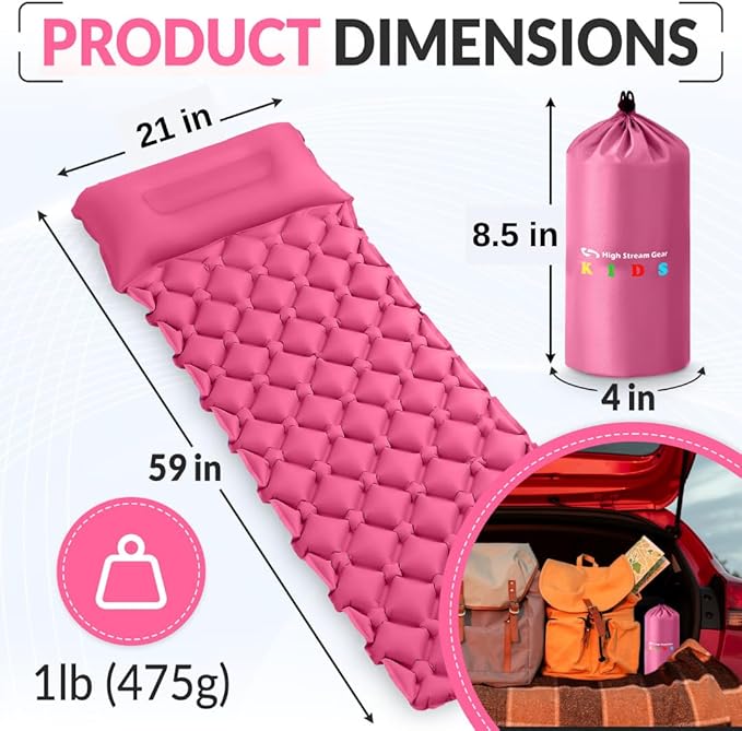 - IDEAL FOR LITTLE CAMPERS: When inflated, this air sleeping pad for kids is 59" x 21" but still packs small and lightweight. camping gear must haves for toddlers and older kids. ADD TO YOUR CART NOW