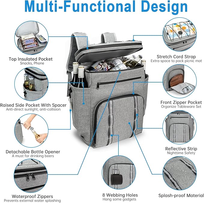 - 【Unique Design for Multiple Needs】The upper waterproof compartment of the cooler back pack is suitable for holding cell phones, tablets, snacks, etc. The addition of a retractable cord allows for the placement of towels, picnic pads, clothes, etc. for quick and easy access. Cooler backpack insulated waterproof front pocket is also equipped with 8 webbing holes for hanging keys, water bottles and other tools.