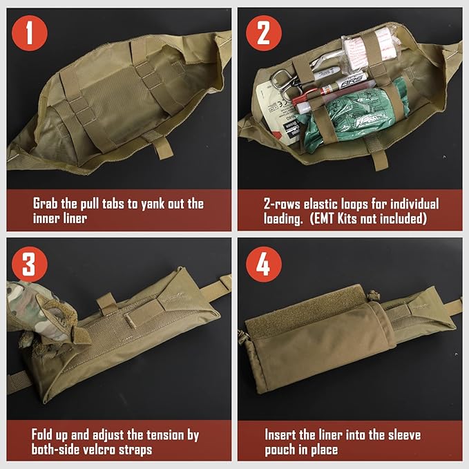 - EXPEDIENTLY ACCESS: First Aid Pouch with an open-ended, ambient extraneous design and adjustable shock cords on both sides to hold items safely. Medical Bag can grab the pull tab from left or right with one hand, outing the insert to access IFAK contents, go to work, and respond quickly and confidently in any situation.