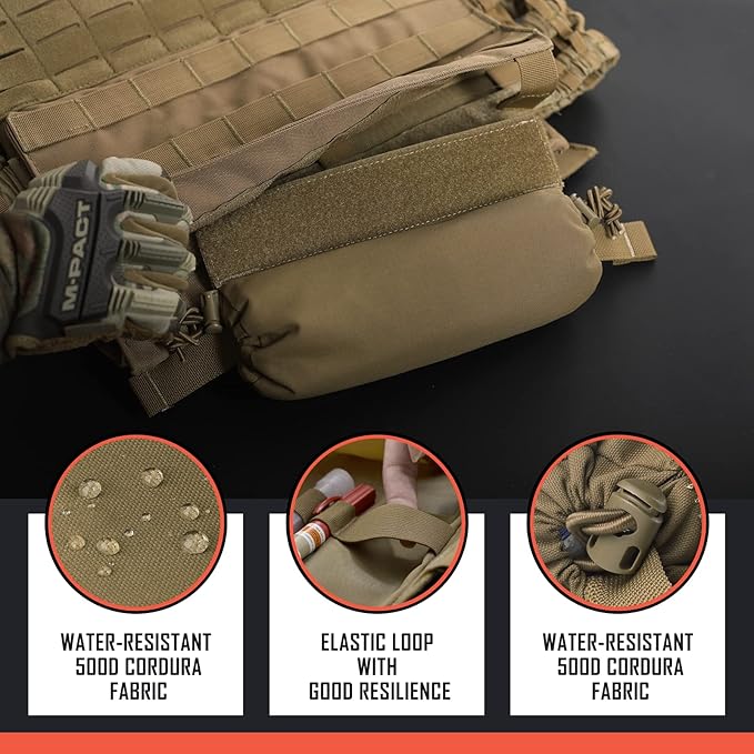 - AGILE LOGISTICS: EMT Drop Pouch is crafted with 500D nylon, making it waterproof and lightweight. Trauma Roll Up Pouch prevents more bulk from being added to your plate vest, allowing you to maintain agility and mobility. Outer size: 9.8"L x 7"H / 24.9 x12cm, providing ample space without compromising weight.