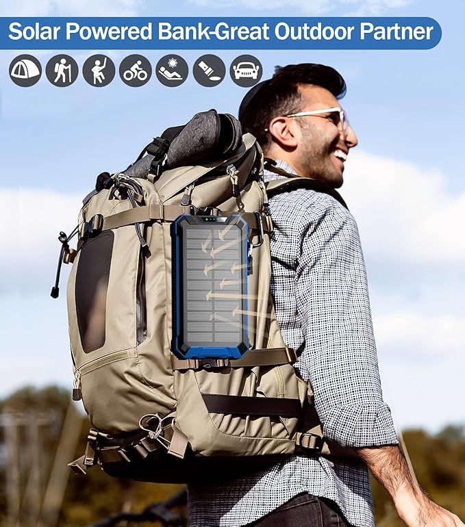 - [Sturdy&Durable Design for Outdoor] This solar battery pack is well made to be Waterproof/Shockproof/Dust-proof, which can withstand the harsh environment outdoors. It’s equipped with Dual super bright LED lights, a Must-Have tool for outdoor activities and home emergencies.