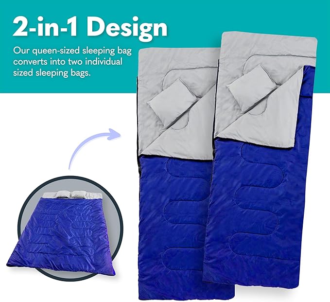 - VERSATILE: This 2-person sleeping bag converts into a roomy queen-size or separates into two individual bags—perfect for solo trips, camping companions, or flexible outdoor adventures.