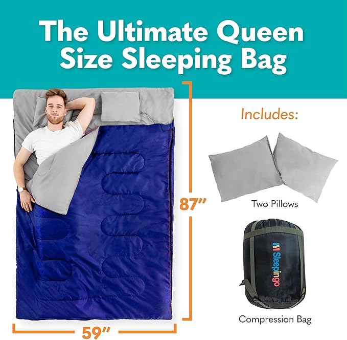 - SUPER WARM & COMFORTABLE: Sleep soundly anywhere without the chill! Unlike cheap, tight bags, this queen-size sleeping bag is durable, portable, and designed for cozy warmth and lasting comfort.