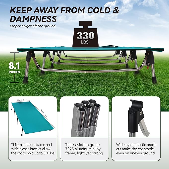 - Steady and Heavy Duty: Thick high strength aircraft-grade aluminum frame and tear resistant nylon fabric enable the cot to support up to 330lbs. Wide plastic brackets on the rod keep the cot stable without wobbling even on unlevel ground. 8 anti-skid feet provide firm grip and evenly distribute weight.