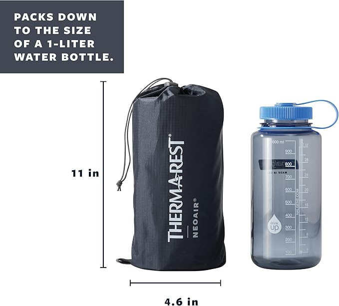 - Foam-free NeoAir design weighs just 19 oz (540 g) in size Regular Wide and rolls up as small as a conventional 1-liter bottle