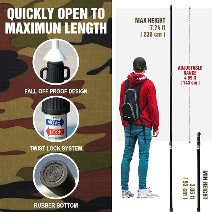 - Included Components : Aluminum Stakes, Telescopic Poles, Camouflage Tent, Nylon Paracord Ropes, Inner Bags