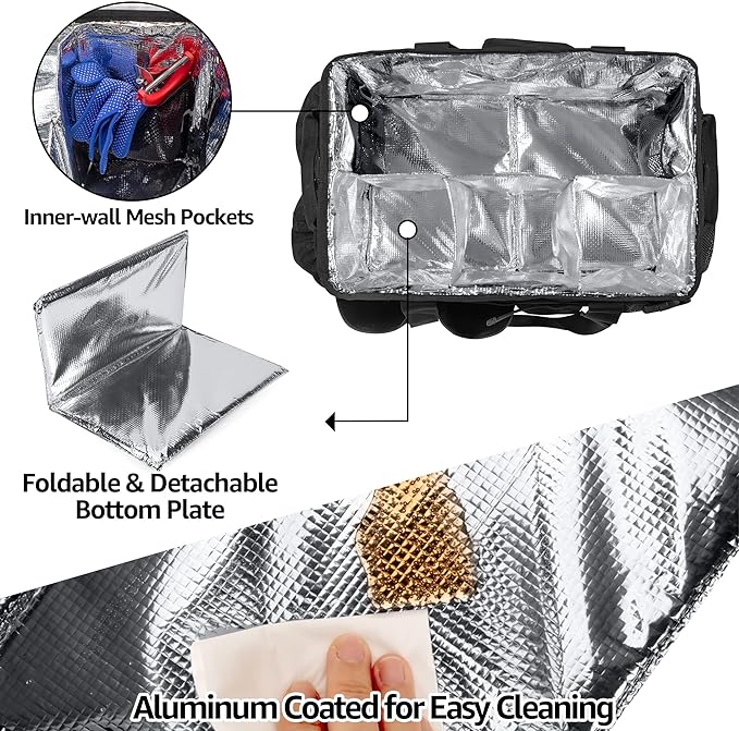 - Interior Aluminum Coated: Main compartment without lid is aluminum coated for easy wipe and cleaning; non-removable dividers and 2 mesh pocket separate the inside to organize the picnic food, drinks, tableware, condiments and tools in an orderly manner