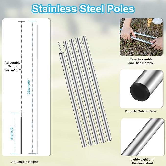- ✅ With Height-Adjustable Poles: PAHTTO camping tarp comes with 2 poles, of which the height can be adjusted from 17” to 90” to satisfy your different needs. You can get different shapes of shade by adjusting the height and the position of the poles tied with the tarp.