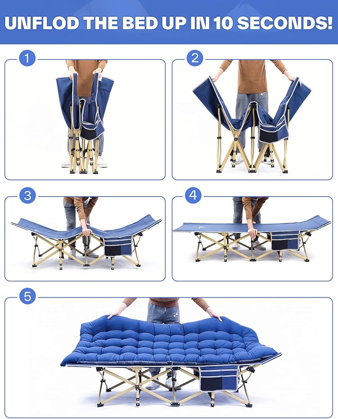 - Double sided Pocket Design: The two lagre pockets of camping cots for adults keep all your things handy right next to you! The ultra convenient side pockets store sunglasses, books, phones, headphones, water bottles and so much more!