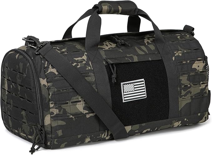 - 【PERSONALISE】 The Laser Cut Molle Webbing Design making this tactical duffle bag special. it uses Two Layers Fabric Laser Cutting MOLLE Hang System to allow all range of pouches attachment. Large area of Hook-and-loop fastener to personalise with our range of patches. One US flag patch for gift(can be removed).