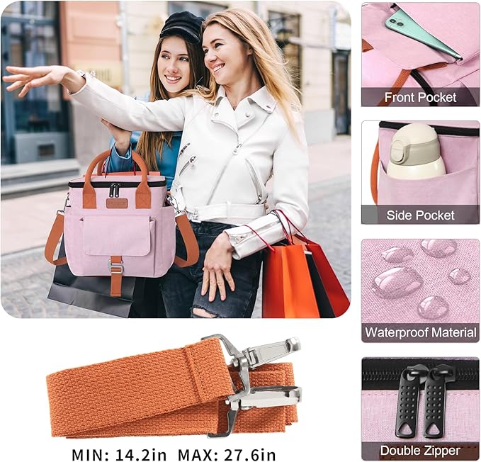 - [CONVENIENT & PORTABLE] The reusable lunch box features one reinforced handle on top and comes with removable and adjustable shoulder straps which can be adjusted from 14" to 27", which provides another carrying option at work with this lunch bag, making it a versatile option that you can carry with your ladies' lunch box to the office, day trips, beach. Stylish and lightweight design is convenient to be used as your lunch bag, cooler bag, picnic bag, sundry bag or shopping bag.