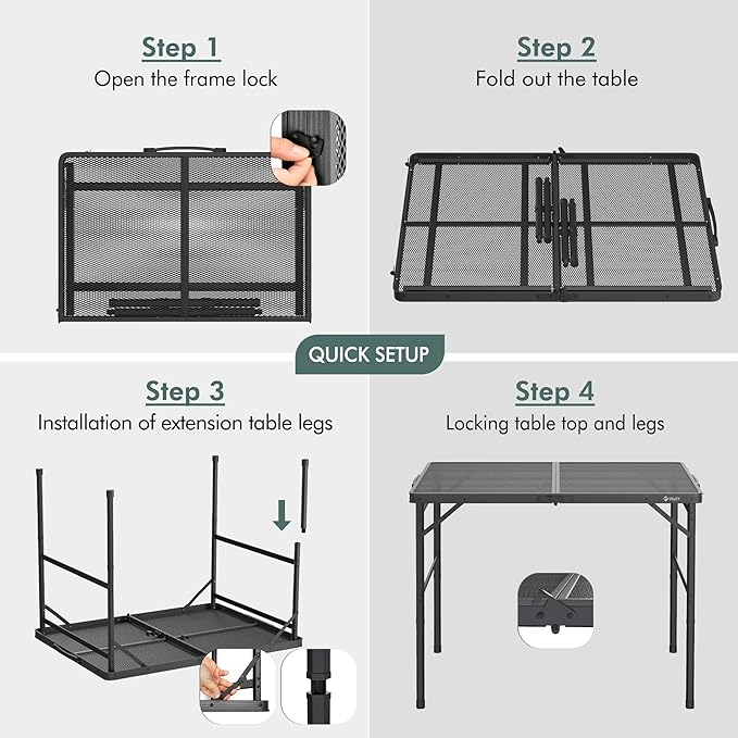 - Easy Set-Up: Designed for easy assembly and disassembly, this portable camping table can be set up in just a few minutes, allowing you to spend more time enjoying your camping experience