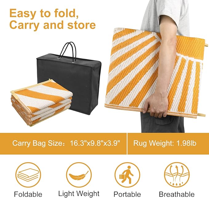 - Easy to Carry&Clean: Outdoor patio rug added seams can be folded to a compact size, and comes with a carry bag for easy carry. Designed with 4 corner loops let you securely stake the mat outdoor for RV camping, and picnic use, no worry about this lightweight rug will be blow away. (Stake loops are not included in the package.) In the face of dirt or sand, simply wipe clean or spray with a hose to remove it, then let it dry quickly.