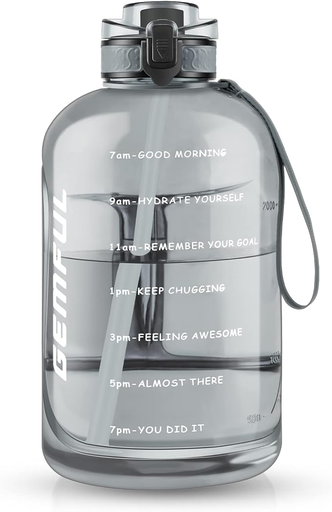 GEMFUL 3 Liter Water Bottle with Straw Time Marker Large 101oz BPA-Free Leakproof Jug for Gym Sports Hiking Motivational Tracking for Men Women (Grey with Removable Straw)