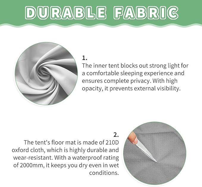 - WATERPROOF & DURABLE: The floor is made from premium 210D Oxford fabric, known for its durability and wear-resistance. With a 2000mm waterproof rating, it keeps moisture at bay, ensuring a dry and comfortable camping experience no matter the weather.