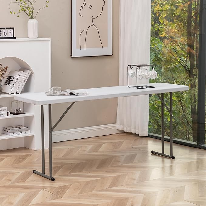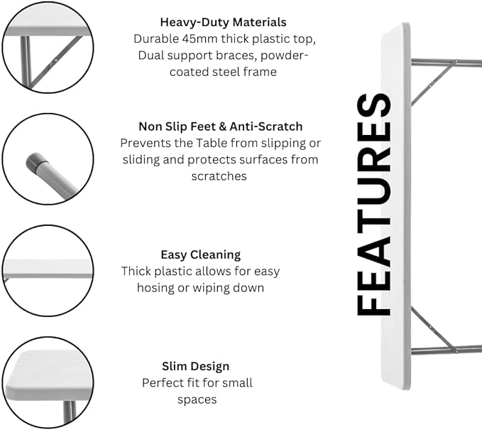 - Smart Choice & Flexibility. Its folding design is a versatile and convenient option for any occasion. Whether you're hosting a training seminar, a client meeting, or just need a place to work, this table can handle it all. Dual support braces, powder coated steel frame with 1.0mm thickness & locking legs mechanism. Its non-slip plastic feet cap for stability & anti-scratch protection. Its sturdy construction can withstand daily use and maintain its pristine appearance for years to come.