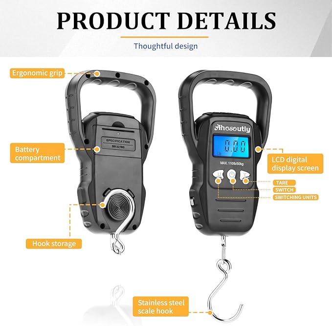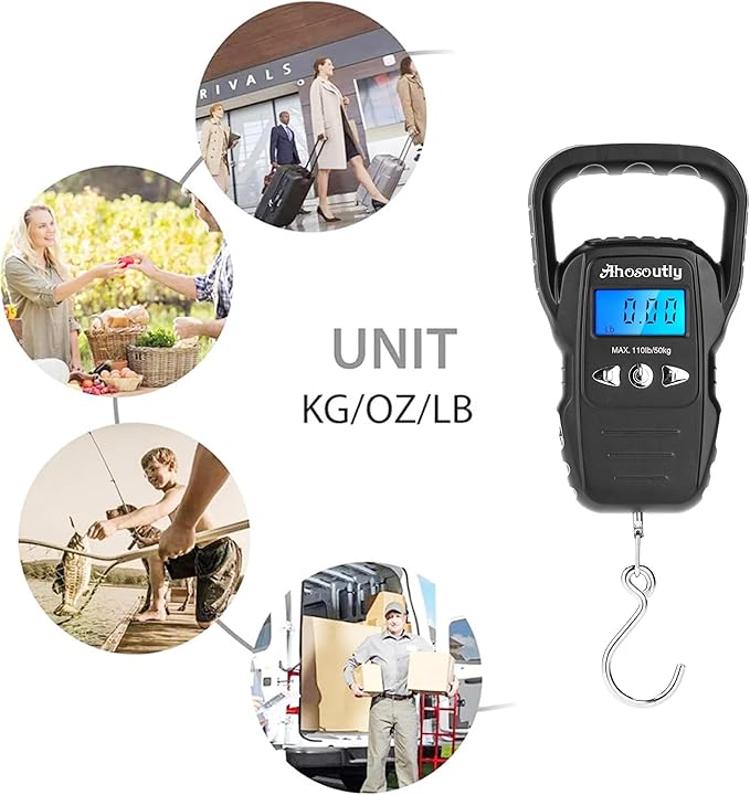 - * 【Luggage Scale with Hook】:The huge stainless steel hook has stronger safety,Preventing detachment when weighing large fish and improving usability.