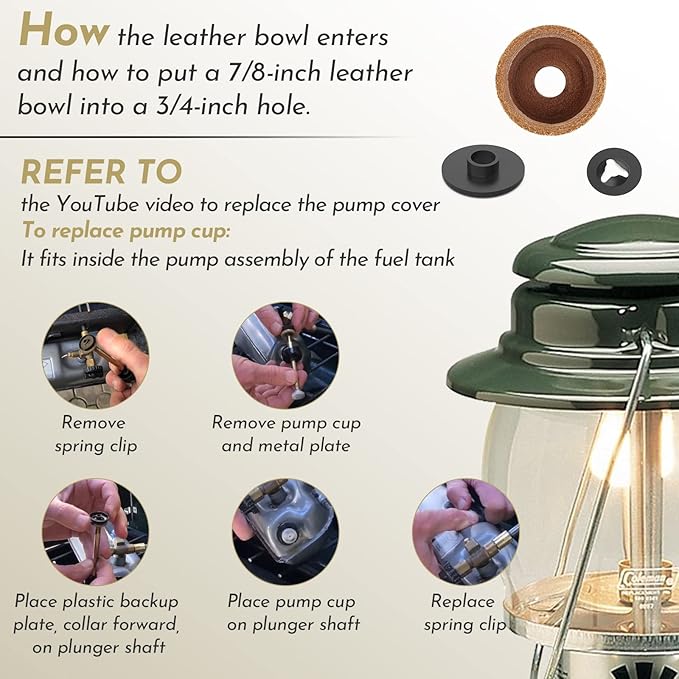 - Easy installation: Our camping stove leather pump cup kit, Easy to install in just a few minutes. compared to buying a new lantern or stove. Using this Coleman Leather Pump Cup replacement part of ours can save you time and money (Please watch the installation video)