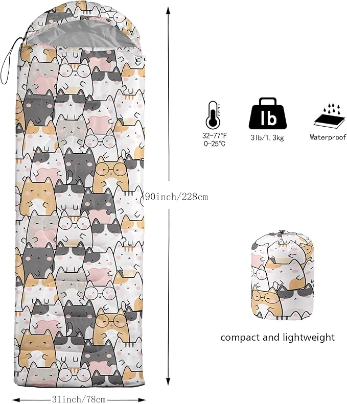 - FITS FOR 3 SEASONS: SIZE - 31 by 90 inches (W x D). Our sleeping bag can be used in 3 seasons with a design temperature of 32℉-77℉(0℃-25℃). These bags also have a weather resistant waterproof design to keep you warm and prevent you from any dampness.