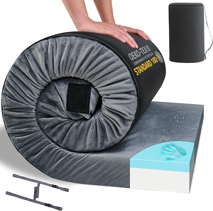 - Portable and Easy to Clean: Designed for life on the go, our portable floor mat rolls up compactly with straps and features a durable zipper for easy cleaning; The removable, washable cover and travel bag make storage and transport a breeze. Adjustable, flexible straps and a complimentary storage bag make it easy to roll up your mattress and immediately head to your next travel destination