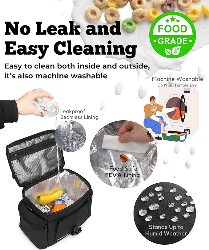 - Easy to clean and leakproof - The exterior is made of a high-density fabric that is rain-resistant and tear proof. Water beads up on the surface, keeping the bag dry even in wet conditions. While the inner PEVA lining is non-porous and seamless that doesn’t let liquid through, so you won’t have leaks or spills. If you do spill something, like soup, oil, or tomato sauce, it's easy to clean up.