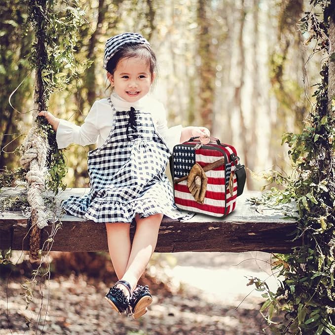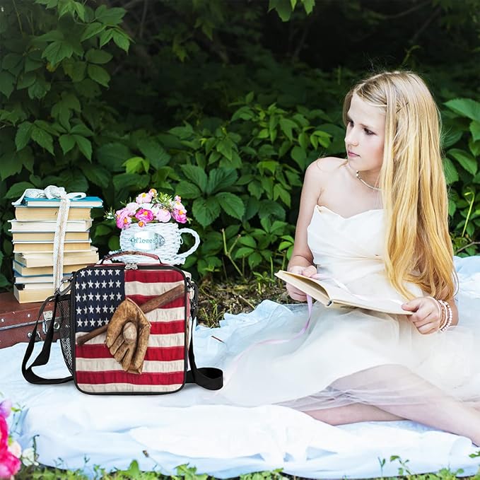 Baseball Usa Flag Insulated Lunch Bag for Girls Boys Teen Reusable Lunch Box with Shoulder Strap Freezable Thermal Cooler Bag Meal Prep Boxs for School Travel Picnic Beach Lunch Pail