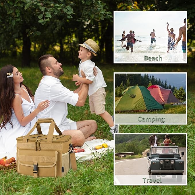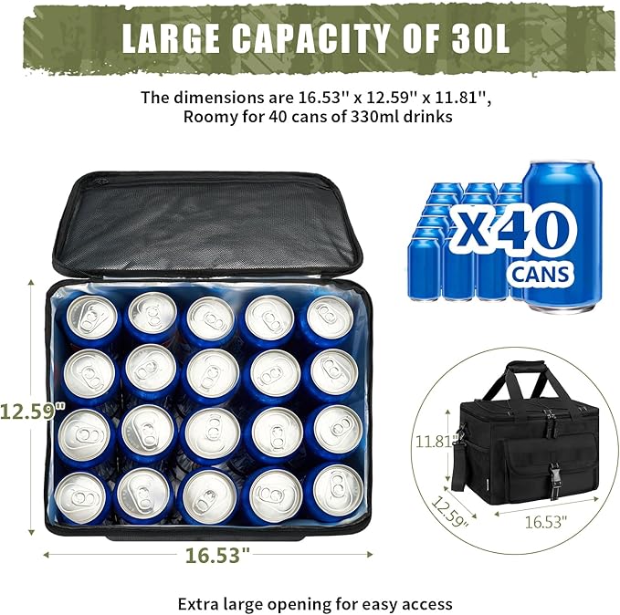 - Ultra-large Capacity: The large picnic lunch bag sized in 16.53"x12.59"x11.81"(L*W*H) with a capacity of 40 cans of 330 ML Cola. A large opening top is quite easy for fetching items. Perfect for picnics, road traveling, beach leisure, bbq, or camping