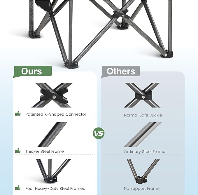 - Sturdy Material: This camping chair has hammer tone powder coating that can prevent corrosion and fading. Four heavy-duty steel frame was added to the bottom of the chair and enforce stability. Sturdy steel frame construction make it can support up to 450lbs/200kg.The 600D Oxford fabric is resistant to tears and abrasions, ensuring that this chair will last for years to come.