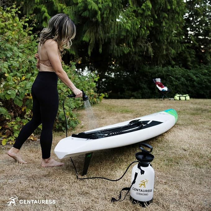- Portable Camping Shower: Made with high-density polyethylene, this 1.3gal/5L portable shower can withstand any conditions. Our camping shower pump has a 5ft 6in hose, 8 nozzle settings, & a shower holder to keep the nozzle clean.