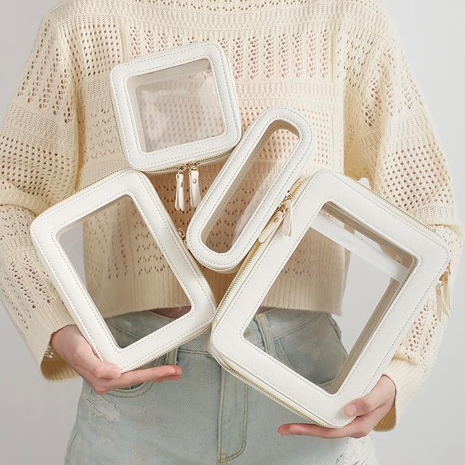 Aveniee Large Clear Makeup Bag Cosmetic bags, Travel Toiletry Bag for Women, Clear Make up Bag Case, Chic Makeup Pouch with Transparent Vinyl Windows & Gold Zippers(White)