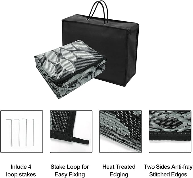 - 【Outdoor Plastic Straw Rug】The patio rug for clearance is manufactured from recyclable polypropylene material. It adopts the double-sided weaving process to make more enduring and breathable. Double Hemmed edges and reinforced corners prevent fraying and tearing.