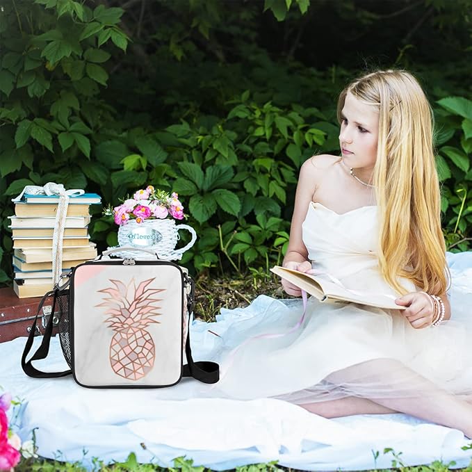 Marble Pineapple Kids Lunch Bag Pinks Pineapple Insulated Lunch Box for Girls Waterproof Lunch Bento Tote Bags Thermal Lunchbox School Lunchbox Insulated with Shoulder Strap