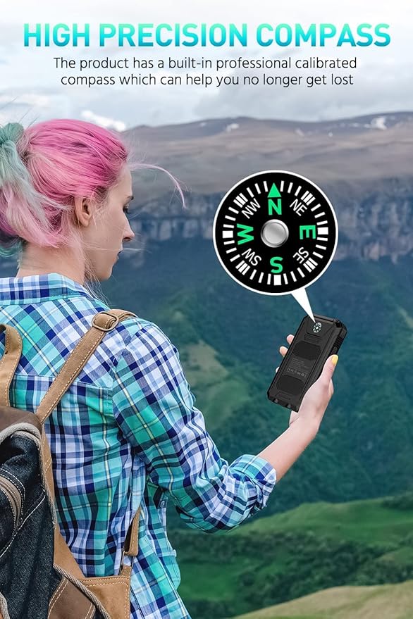 - The solar charger comes with a high-precision compass: Own comes with a portable compass, a handy tool for outdoor activities, like camping, cycling, fishing, traveling, hiking and beaches.