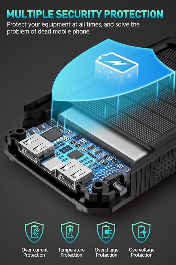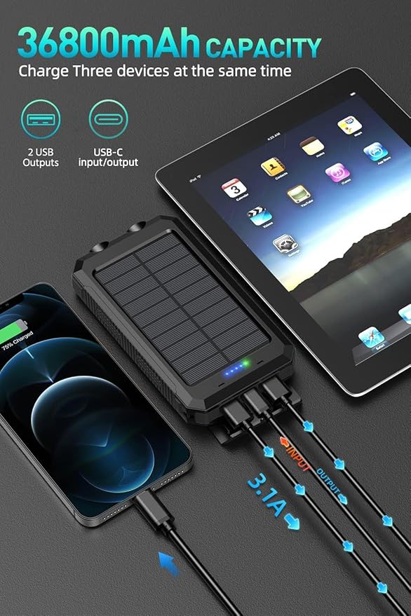 - High Capacity Portable Solar Power Charger: Built-in 36800mAh high capacity Lithium battery equipped with a high performance solar panel, anti-explosion, lightweight and reliable. Long lifespan with more than 1800 recharging times. which could recharge the battery itself under sunlight, eco-friendly and ideal for outdoor use.Made of durable and resistant ABS+PC Material which protect it from rain, dirt and shock.