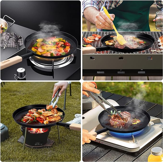 - Portable, Lightweight Griddle Pan--- The grill pan is 0.5 pound (230 grams), with a detachable wooden handle. You can easily store the flat pan in your backpack, camping bags and take it on the go. The flat grill pan is ideal for camping, griddle, BBQ, outdoor cooking.