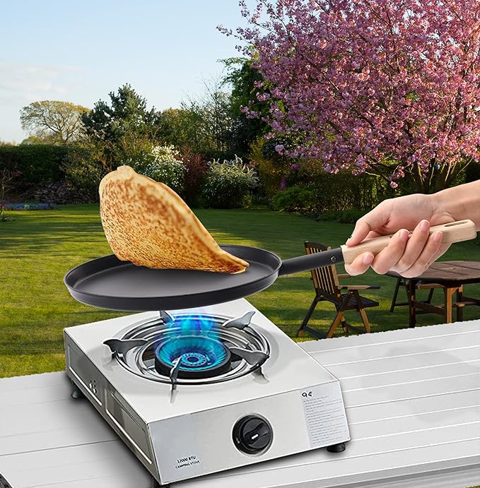 - In addition to being easy to carry around for camping, this pan also perfect for crepes, tortilla, dosa tawa, toast, pancakes, eggs, omelet, bacon and more