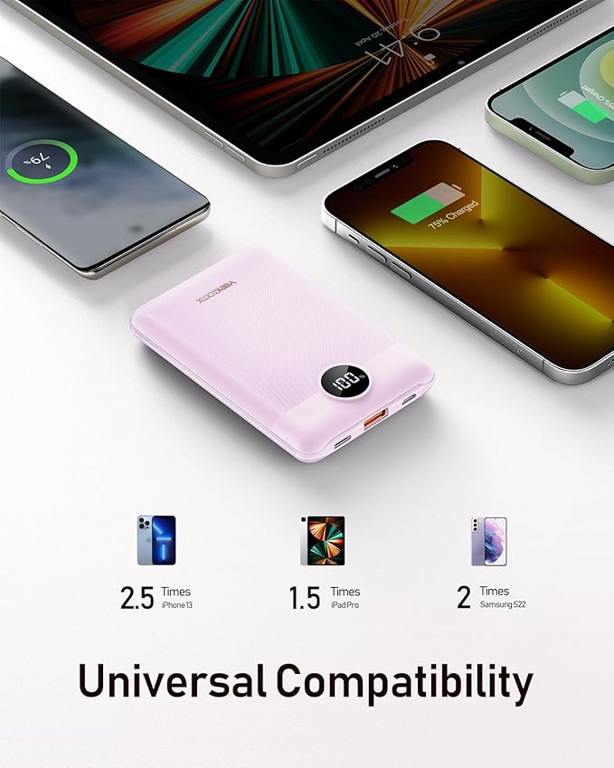 - [ Wide Compatibility ] The USB C power bank for iPhone equipped with Dual USB-A and USB C ports compatible with a wide range of devices including iPhone 15/14/13/12/11/X/8/7, Samsung Galaxy S24/S23/S22/S21 Galaxy Z Flip/Z Fold/Galaxy A51/52/53/54, and other USB C devices such as smartphones, iPad, tablets, headphones, USB lights, USB fans, heated vests jackets, and more. It's a versatile charging companion for all your on-the-go needs.