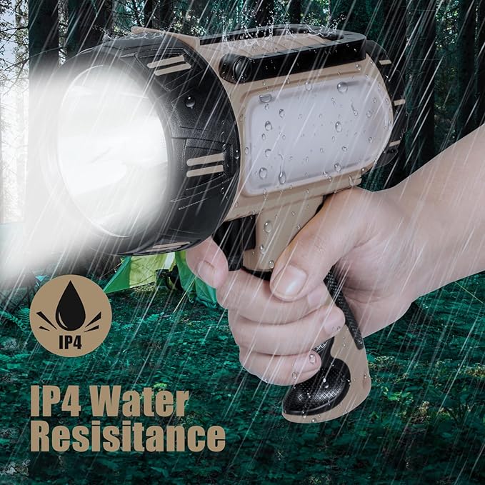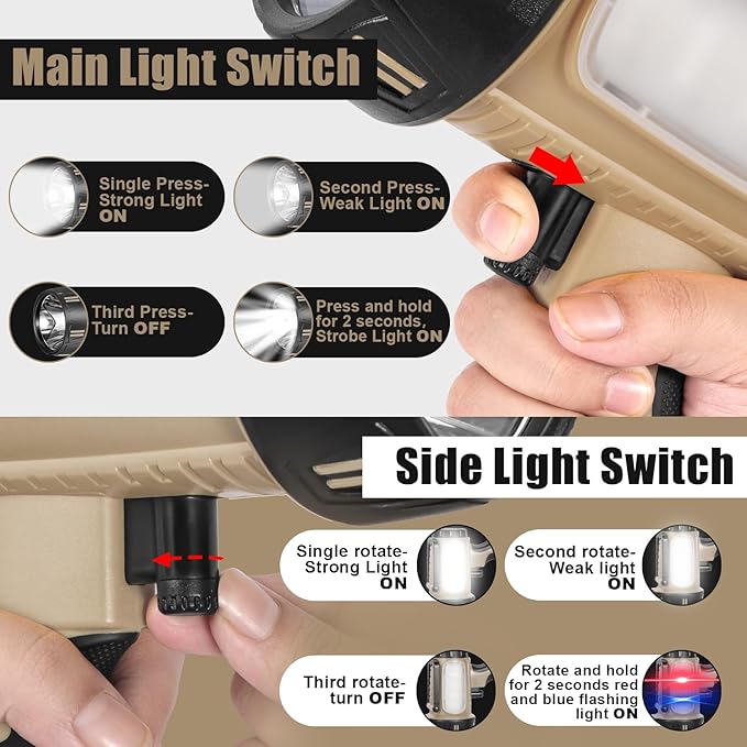 - SUPERBRIGHT HANDHELD SPOTLIGHT: The main light has 3 brightness modes: Single press strong light ON, Second press weak light ON, Third Press turn OFF, Press and hold for 2 seconds, strobe Mode ON.The side light also has 3 brightness light modes: Single rotate Strong light ON, Second rotate weak light ON, Third rotate turn OFF, Rotate and hold for 2 seconds, red and blue flashing light ON.