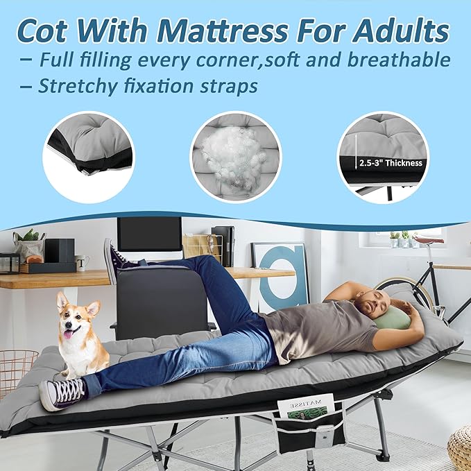 - Folding Bed with Mattress: For the most comfortable sleep experience, our sleeping cot deigns with a 2.5-3 inch thick, skin-friendly, material-split mattress. Note: The mattress is removable so you can take it off when it gets too hot.