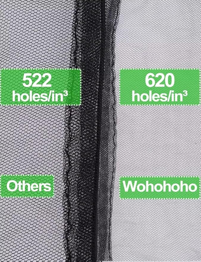 - Soft and Durable Mosquito Net: Wohohoho bug net for the head is crafted from 100% nylon and features approximately 620 holes per square inch. It's lightweight knitted mesh allows fresh air circulation, no glare in the sunlight, helping to keep you cool during the summer.