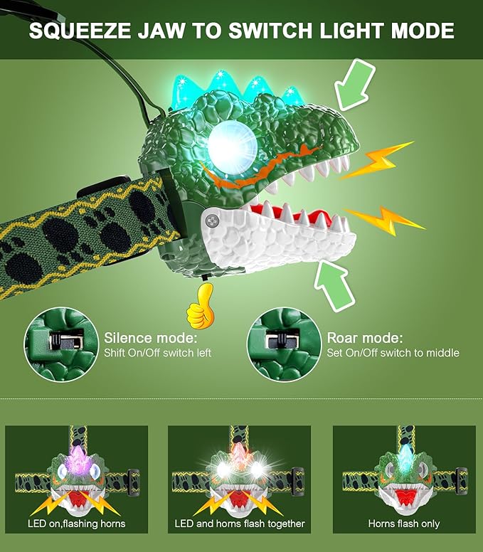 - 3 Lighting Modes & Realistic Dinosaur Roar: This kids animal headlamp combines functionality with fun. With constant light, strobe, colorful glows, and a primitive dinosaur roar mode, it offers a thrilling experience. Simply press the jaw to activate. Silence mode is available with a left shift of the On/Off switch, providing a light-only option. Let your child enjoy versatile lighting and customize their adventure with this captivating kids animal headlamp