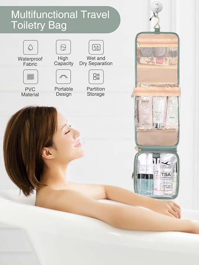 Relavel Travel Toiletry Bag for women with Detachable TSA Approved Toiletry Bag, Compact Hanging toiletry bag with Small Carry On 3-1-1 Clear Waterproof Travel Bags for Toiletries (Green, A Small)