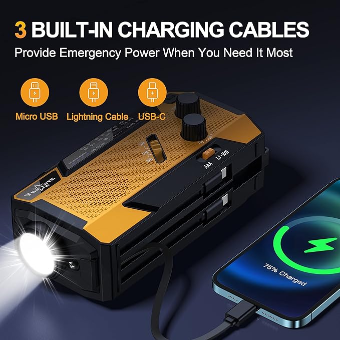 - 【7400mWh EMERGENCY RADIO WITH 3 BUILT-IN CABLES】Different from the other hand crank radio in the market, this hand crank emergency radio doesn't only have a built-in 7400mWh battery that can be used as emergency power, but it also comes with 3 built-in charge cable (including Lightning/USB-C/Micro USB), you can use these cables directly charging for your different devices at the same time and never worry couldn't find the cables when you need it most.