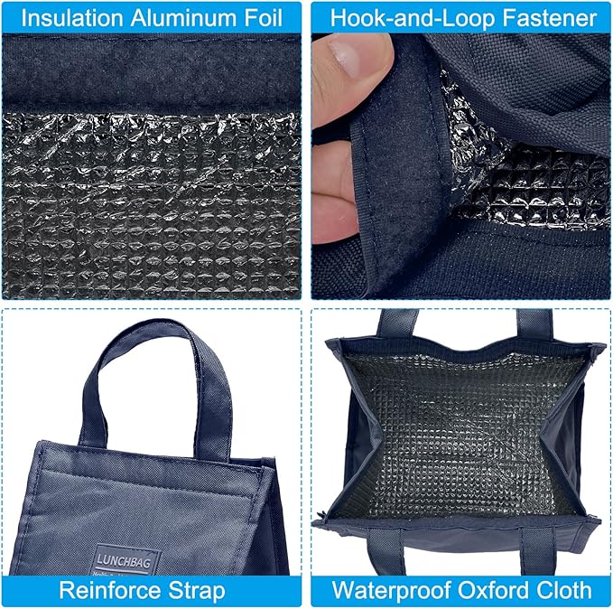 - Advantage: The lunch bag is made of waterproof Oxford cloth and an aluminum foil insert, which is durable and tear-resistant. The interior is equipped with thermal insulation cotton and aluminum foil to avoid heat and effectively keep warm and cold. The top zipper and the hook-and-loop fastener are easy to open and close. Equipped with a hand strap, it has a strong bearing capacity and is easy to carry.