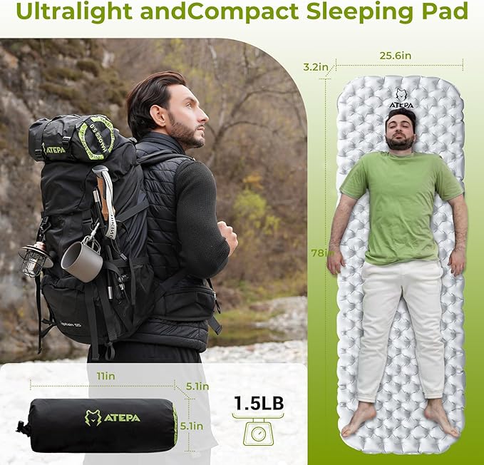 - BACKPACKING SLEEPING PAD – ULTIMATE COMFORT ON THE GO: Perfect for backpackers, campers, and hikers, this pad combines a lightweight design (1.7 lbs) with a compact size for easy packing, providing you with superior comfort wherever you travel.