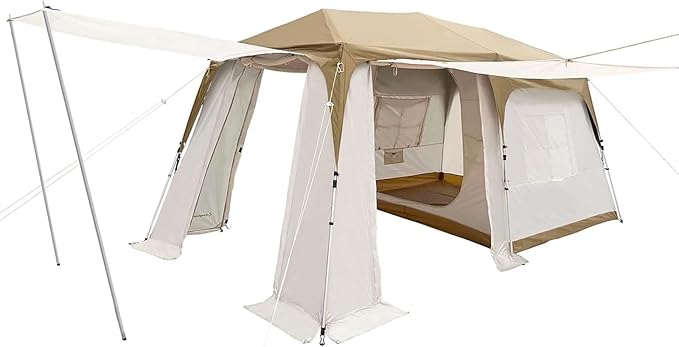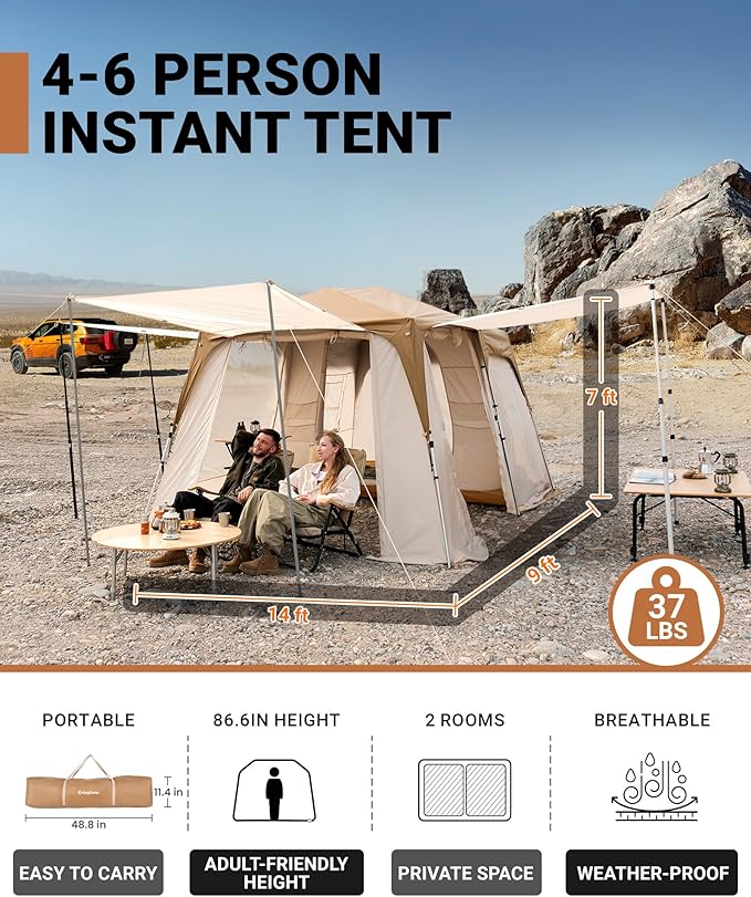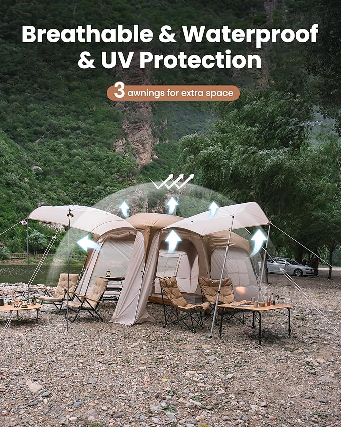 - EXCELLENT VENTILATION: Stay cool even on hot days with the tent’s outstanding ventilation system. Two large breathable mesh windows and two side windows promote cross-ventilation, while the 3 extendable awnings enhance airflow and reduce heat buildup, keeping the interior comfortable.